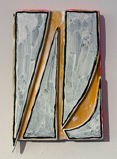 Ryman has hung three of the gallery walls with a sprawling "Constellation" installation, an ongoing project of the artist’s which places small polychrome wooden abstractions in irregular diagonal grid patterns. Despite the celestial name, the objects do not act as independent light sources in themselves; instead, Ryman plays with color saturation and intensity, coating the sides of his lilliputian creations with bright pigments which imbue the reflected light with a gentle tint of the pigment’s color, intermixed with the “normal” gray shadows cast by the sculpture’s volume. The effect is eerie, as it reminds us that even when we aren’t aware of the presence of light, it is everywhere, bouncing off surfaces in the gloom. Ryman’s "Constellations," like the mystic arrangements of stars themselves, herald an unseen presence. The front-facing portion of the sculptures challenge the vapor-like glow—crisp, opaque designs dance across the surfaces, and remind us of the two kinds of light; in "Shingle #1" and "Shingle #3" (both 2024), Ryman composes intricate abstractions composed of sharp painterly solid forms floating over darker backgrounds. These objects are tiny but insist on individual attention. In "Press Cake #4" (2024), a series of black, white, and gray vertical striations on the front of the piece seem to emit a jarring pink light at top, like a bunch of smoldering embers. “Frame Trace #30” (2024) on the other hand, has glowing paint in a delicate line along the sides and top of its front as well as on the side of the volume, giving the impression of a glowing doorway or lantern. “Western Curves #5” (2024) presents a corner instead of a flat plane, and the luminous paint is instead projecting its subtle light directly at the viewer.