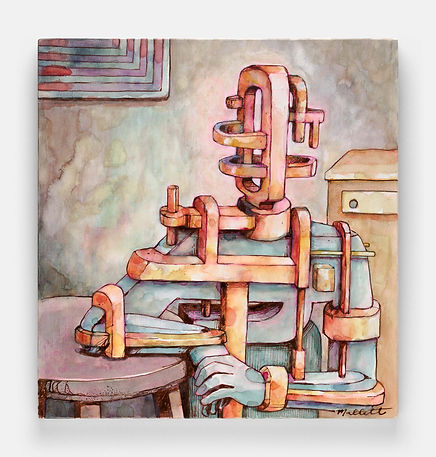 Technology, civilization, and humanity amalgamate into these living yet physiologically impossible enigmas. Even Mallett's choice of medium is telling. He employs the illustrator's materials of ink and water-based color. Mallett is very much a product of late 20th-century culture. His images would be right at home in the adult graphic magazine “Heavy Metal,” or its French predecessor, “Metal Hurlant” magazine. Yet, make no mistake, despite the illustrator’s materials, Mallett is not an illustrator. His purpose is not to illuminate another's story, sell a product, or promote anyone else's agenda. These are his intimate visual journals of day-to-day living. Indeed, behind most of these pictures are written, by long hand, personal observations regarding the creation of each picture, sometimes referencing an event, a person, or a feeling that infuses his work with the human foibles we all identify with. We recognize that his struggle mirrors our own. Yet, inspiringly, he creates his way out of his troubles by re-confirming his reality as a design of his very intellect: these gloriously uncanny biomorphic creatures.